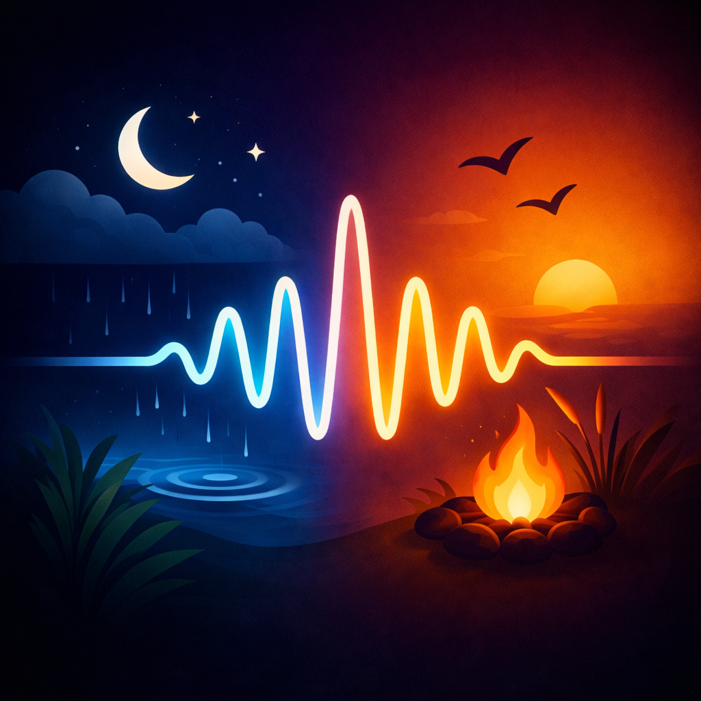 Rain, ocean, fire, birds, cafe chatter, white noise, and more. Each with two recording variants for subtle variety.